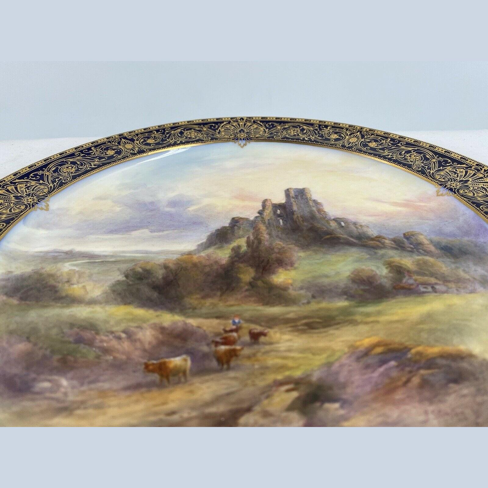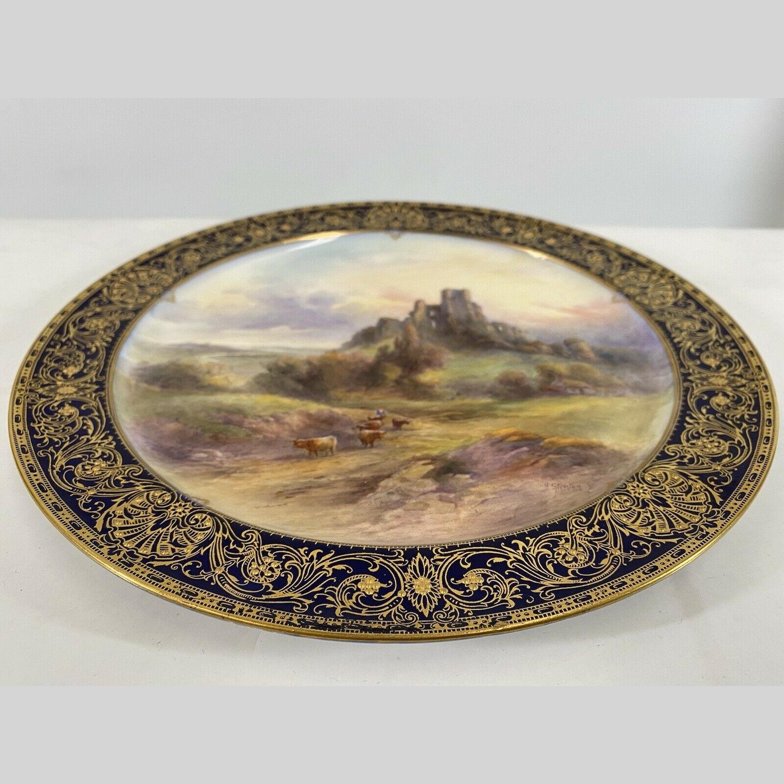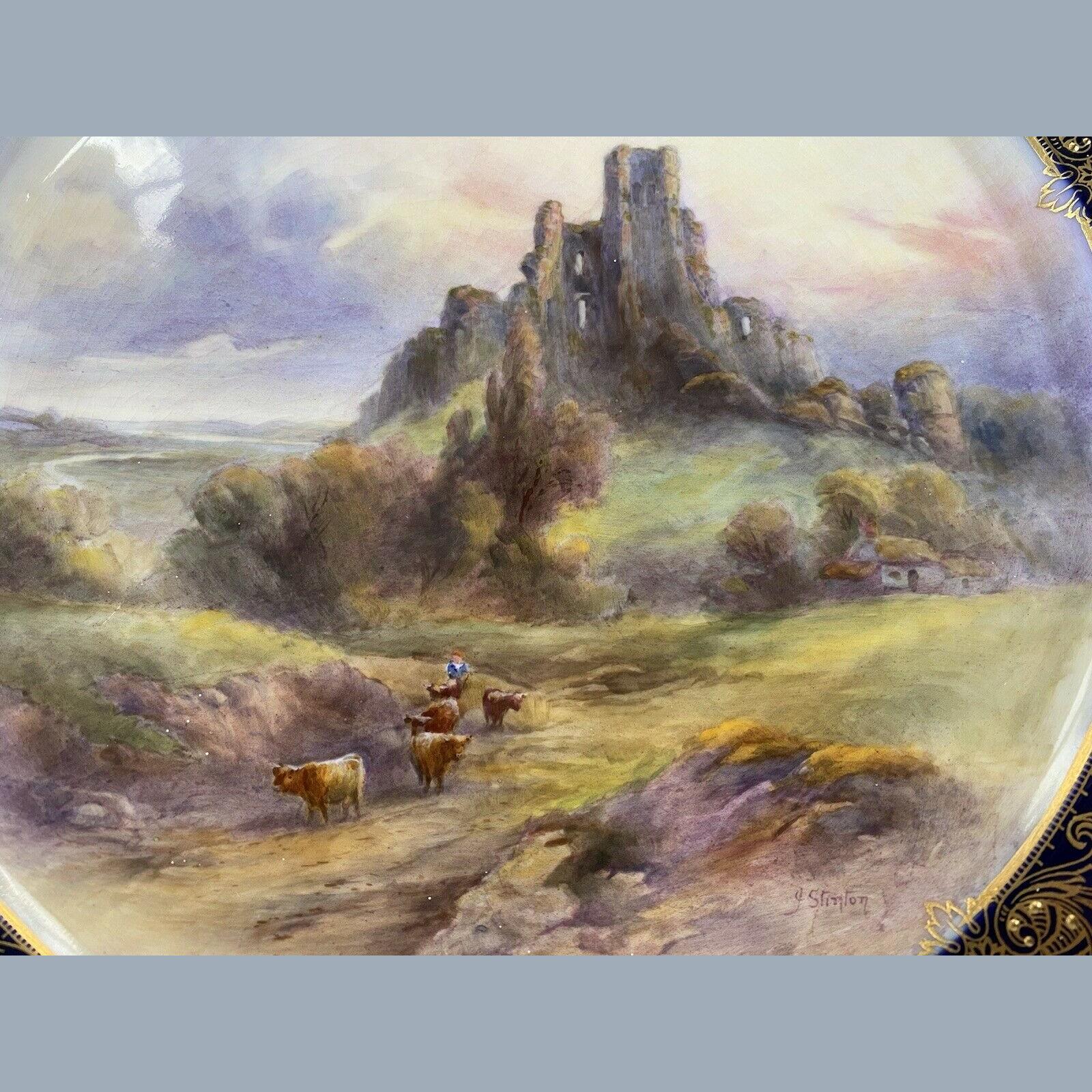John Stinton Junior is best known for his famous Highland cattle scenes but also produced many paintings of English cattle and was a fine painter of British castles which appear over his signature, on many Worcester cabinet plate centres.